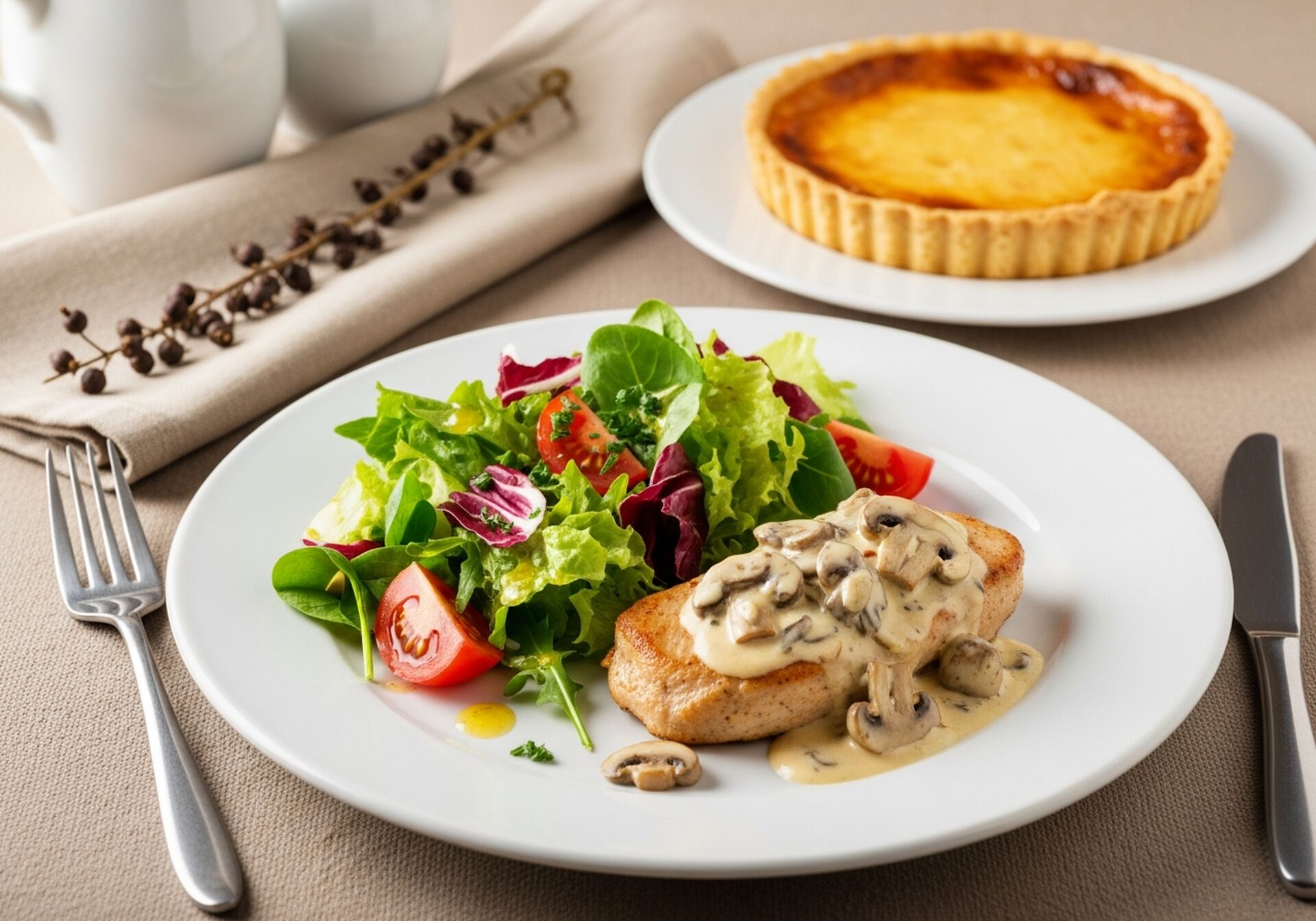 Un menu équilibré à petit prix : salade fraîche, filet de poulet aux champignons, dessert du jour. Parfait pour vos repas professionnels ou à domicile. Cuisine maison, rapidité et goût au rendez-vous chez La Toque Dorée.